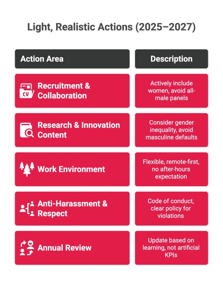 - Recruitment: Avoid all-male panels; active inclusion in calls.